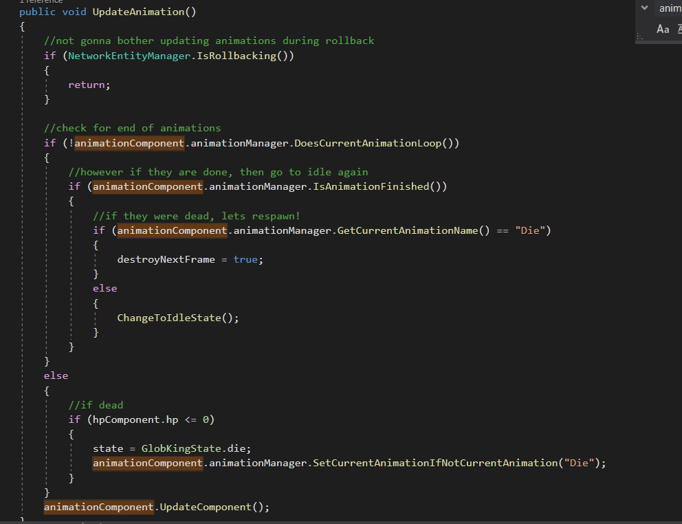 Last thing here is to make sure our Network Entity knows about this Animation Component. This example the GlobKing script extends the NetworkEntity class with added attribute Animation Component(not all network entities need animation, so you need to add it to your custom scripts if you need it), so this is where we setup the animation component: